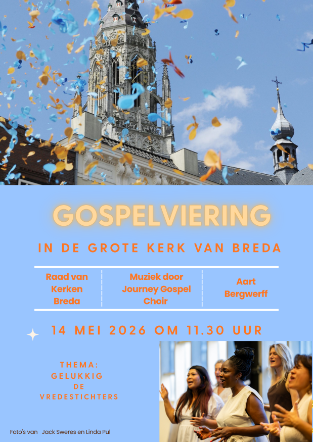 Ook dit jaar weer op Hemelvaartsdag 14 mei, voorafgaand aan de opening van Breda Jazz Festival, vindt de traditionele Gospeldienst plaats in de Grote Kerk van Breda. Journey Gospel Choir komt met toetsenist Anko Wong Loi Sing en solozangeres Jane Loois. Ook Aart Bergwerff, organist van internationale allure zal een muzikale bijdrage leveren.